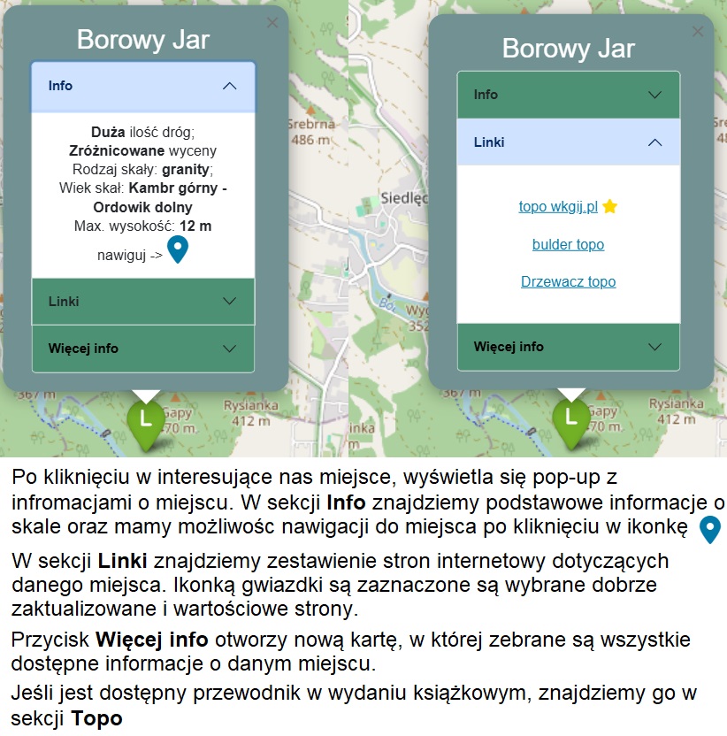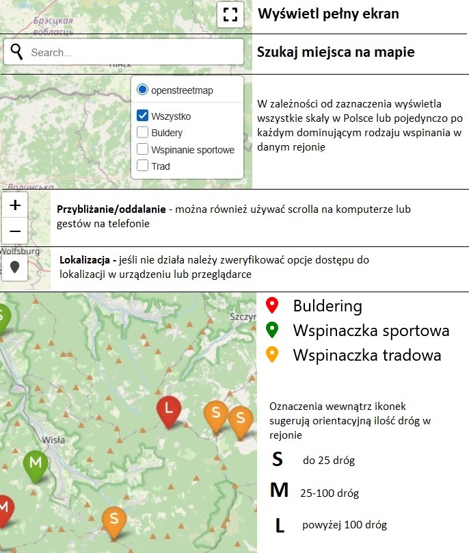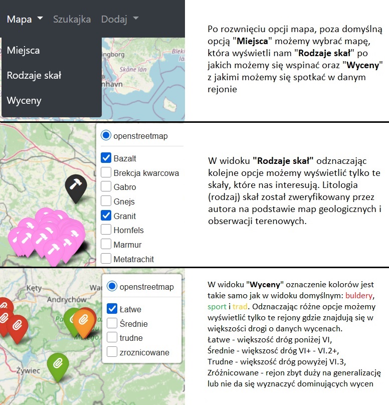 Dane o skałach należy traktować informacyjnie i weryfikować je samodzielnie! Nie każda pojedyncza skałka została uwzględniona na mapie - w miejscach występowania wielu skałek w jednym miejscu są one zgrupowane w rejony (Np. Mirów, Rzędkowice). Takie podejście wynika z próby uczytelnienia mapy (i nie narobienia sobie roboty na 5 lat). Baza danych jest uzupełniana z maksymalną starannością, jednak mogą pojawić się błędy, za które serdecznie przepraszam.